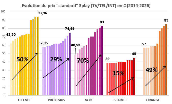 Les augmentations tarifaires sont devenues une tradition annuelle chez les opérateurs télécom. Proximus et Scarlet avaient déjà annoncé une hausse à partir du 1er janvier, Telenet a fortement augmenté ses prix ces trois dernières années, et Orange a récemment rejoint le mouvement en adaptant les tarifs de ses offres et de celles de sa marque VOO. En 12 ans, les consommateurs belges ont dû encaisser de nombreuses hausses de prix.