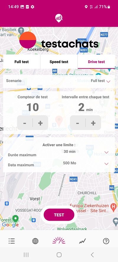 Avec le Drive test, vous pouvez réaliser une série de plusieurs tests dans un laps de temps déterminé. Vous pouvez ainsi exécuter des mesures pour un trajet donné, par exemple un trajet en train de la maison au travail. Vous déterminez donc vous-même le nombre de tests que vous voulez effectuer (5, 10, 20, 30...) et définissez le nombre de minutes d’intervalle entre chaque test.