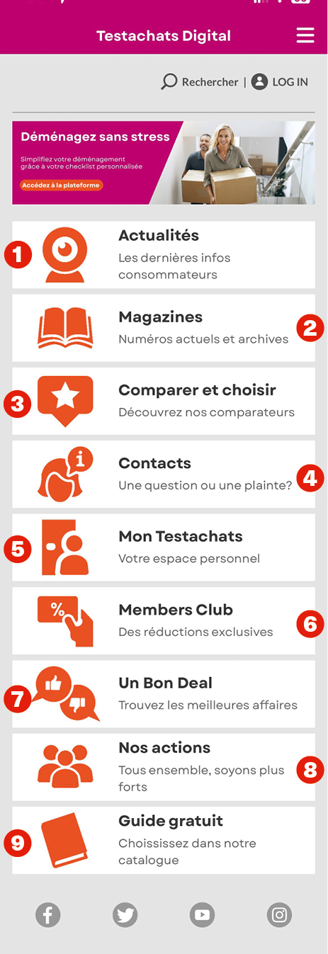Depuis l'écran d'accueil, vous pouvez directement cliquer sur les dernières infos consommateurs, vos magazines, nos comparateurs, toutes les actions en cours, les numéros de contact de tous nos services, votre espace personnel et le catalogue de nos guides pratiques.