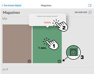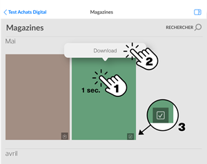 Derrière cette icône, vous trouverez tous les magazines. Cliquez sur la couverture pour voir la page de contenu complète, puis lisez tous les articles en ligne. Vous pouvez également télécharger un numéro au préalable afin de pouvoir le lire hors ligne. Ceci peut se faire de deux manières. Vous pouvez appuyer sur l'icône de téléchargement sous la couverture du numéro. Le téléchargement débutera rapidement. Vous pouvez aussi maintenir votre doigt appuyé sur la couverture. Confirmez ensuite le téléchargement. Votre téléchargement se lancera alors. Quand il est terminé, une coche apparaît sur le bouton de téléchargement.