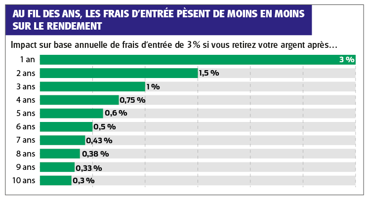 Ne payez toutefois jamais plus de 1% de frais d’entrée, et n’hésitez pas à négocier ces frais à la baisse s’ils vous paraissent trop élevés. N’oubliez pas non plus qu’en tant qu’abonné à Test-Achats, vous pouvez bénéficier de conditions favorables grâce à notre collaboration avec les courtiers DefA Finance (www.defa.be) et VDV Conseil (www.vdvconseil.be).