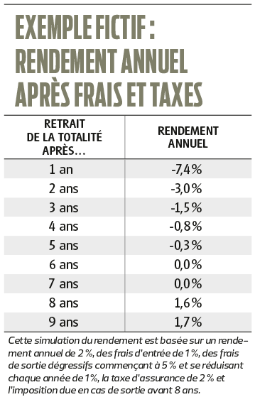 Tout comme pour les frais d’entrée, il s’agit d’une ponction unique, dont vous pouvez réduire l’impact en conservant suffisamment longtemps votre assurance-épargne.
