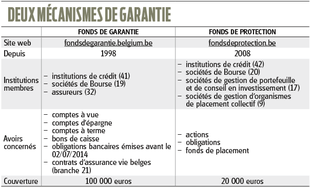 Depuis 2016, le Fonds de protection des dépôts et des instruments financiers ne s’occupe plus que des instruments financiers, les dépôts (le cash) étant protégés depuis la même année par le Fonds de garantie. Le Fonds de protection… protège les actions, les obligations et les fonds de placement que vous avez placés sur un compte-titres auprès de votre banque, de votre société de Bourse ou de votre société de gestion. Si pour l’une ou l’autre raison vous ne parvenez pas à récupérer ces avoirs, vous pouvez, en cas de perte, vous adresser au Fonds de protection.