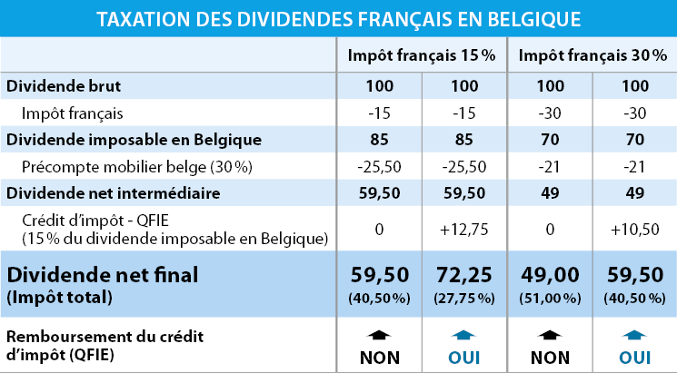 En juin 2017, la Cour de cassation a jugé que le fisc belge devait, pour compenser l’impôt français, octroyer un crédit d’impôts, qu’on appelle dans le jargon QFIE (quotité forfaitaire d’impôt étranger). Ceci en vertu d’une convention établie entre la Belgique et la France, mais qui n’a jamais été appliquée jusqu’ici. Comme le montre le tableau ci-dessous, ce crédit d’impôt permet d’augmenter sensiblement le dividende net octroyé à l’investisseur.