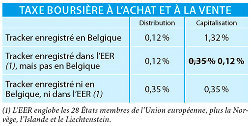 Si investir dans un tracker (= fonds indiciel coté en Bourse) est très simple, déterminer le montant de la taxe boursière à payer constitue une autre paire de manches. Il existe en effet trois taux différents (0,12 %, 0,35% ou encore 1,32%), ce qui ne facilite pas la tâche de l’investisseur. Le fait que votre tracker distribue ses dividendes (fonds de type distribution) ou les réinvestit (fonds de type capitalisation), ainsi que l’endroit où est enregistré le tracker, déterminent le tarif applicable à votre tracker (voir tableau).