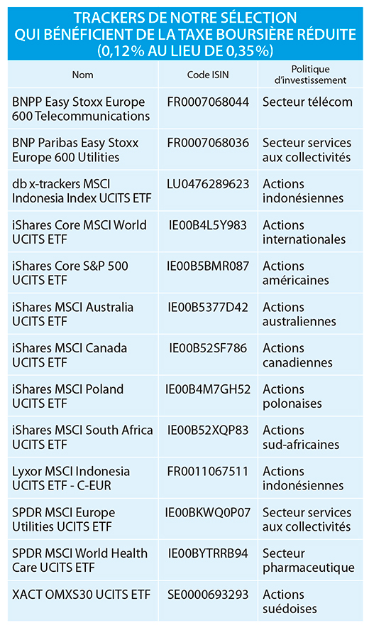 Le tableau ci-après reprend tous les trackers de notre sélection pour lesquels la taxe de Bourse a été revue à la baisse.