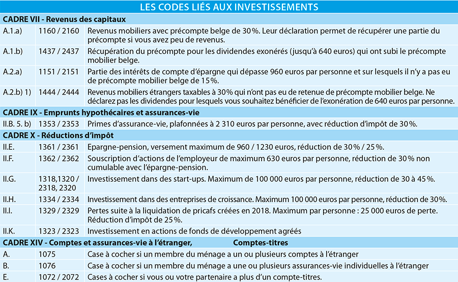 La taxe sur les comptes-titres s’est invitée dans la déclaration des revenus. Pour faciliter les contrôles et pour décourager ceux qui ne voudraient rien déclarer, le fisc a prévu une case qu’il faut noircir si vous êtes titulaire ou co-titulaire de plus d’un compte-titres. Il faut tenir compte de tous les comptes-titres, en Belgique ou à l’étranger, même s’il n’y a plus rien dessus et même si vous ne devez pas payer de taxe sur les comptes-titres. Si vous avez investi dans un projet de crowdfunding via une plateforme qui n’est pas un banque ou une société de Bourse, il ne faut pas mentionner le compte que vous détenez auprès de cette plateforme. Si vous êtes cotitulaire d’un compte avec votre partenaire et que vous en avez un autre à votre propre nom, vous devez cocher la case 1072/2072. Même chose si vous êtes membre d’une association de fait (par exemple un club d’investissement) et que vous avez un compte-titres personnel. Il ne faut pas indiquer le nombre exact de comptes-titres. N’oubliez pas que si vous avez un compte-titres à l’étranger, il faut aussi le signaler plus haut dans le même cadre de votre déclaration !