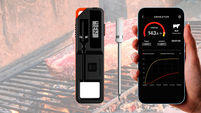 L’ARMeator A1 est un thermomètre à viande Bluetooth (sans fil donc) qui fonctionne avec deux capteurs : l'un pour la température à cœur de la viande et l'autre pour la température de votre barbecue ou de votre four. Grâce à l'application ARMEATOR (disponible pour iOS et Android), vous suivez tout avec précision. Le thermomètre a une portée allant jusqu'à 70 mètres (réduite à 10 mètres si le barbecue est fermé). La température est mise à jour toutes les secondes et est précise à ± 0,1 °C.