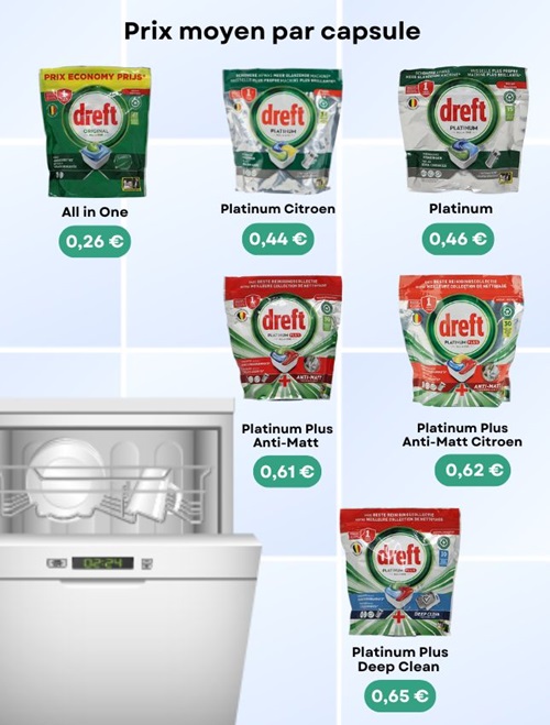 Nous avons testé 6 types de tablettes pour lave-vaisselle Dreft, avec des caractéristiques et des prix différents. Vous trouverez ci-dessous les modèles les moins chers et les plus chers.
