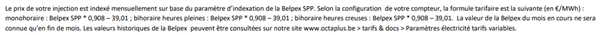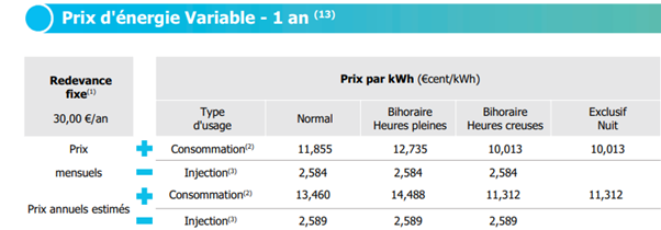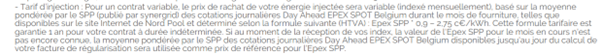 Pour ajouter à la confusion, chez certains fournisseurs, le tarif d’injection indiqué sur la fiche tarifaire est calculé sur base d’une estimation annuelle, tandis que d’autres ne mentionnent que le prix mensuel ou trimestriel le plus récent. Cela complique la comparaison pour les consommateurs. Dans un scénario idéal, un fournisseur devrait indiquer les deux : l’estimation annuelle, pour faciliter la comparaison, et le tarif le plus récent, afin que les clients sachent à quoi s’attendre aujourd’hui.