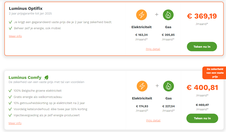 Sur la page d'accueil du fournisseur d'énergie Luminus, une publicité pour le contrat Comfy attire immédiatement l'attention. Il s’agit plus précisément d’un contrat fixe pour l'électricité et le gaz. Un élément nous intrigue: les tarifs Comfy sont proposés sous la rubrique "nos prix les plus avantageux pour le gaz et l'électricité", or, le contrat Optifix est en réalité le moins cher. Ce contrat moins cher est d’ailleurs bien plus difficile à trouver sur le site web...