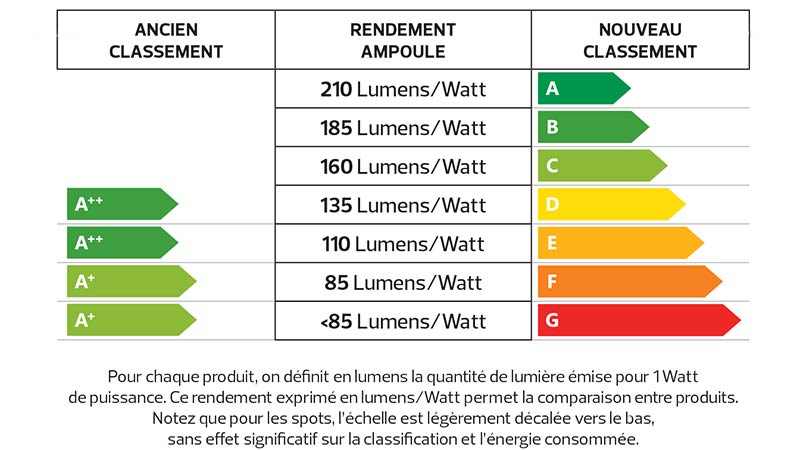 Il faut dire que l’ancienne échelle, cumulant les + après la lettre A, peinait à traduire les remarquables gains d’efficacité que nous-mêmes constations au fil de nos tests et brouillait du même coup le choix des consommateurs soucieux d’acheter des lampes les plus performantes, moins chères à l’usage.