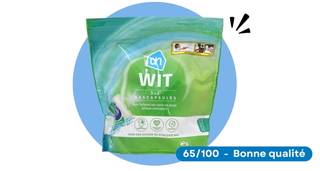 Cette lessive en capsules d'Albert Heijn se montre très performante pour éliminer les taches de graisses et reste très bonne pour enlever les autres types de taches. Elle assure aussi un très bon respect du blanc des vêtements et coûte 0,20 €/dose.