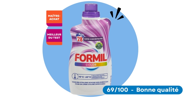 Formil Color Super Concentrated a obtenu à la fois le label de Meilleur du test et de Maître achat.Cette lessive est excellente pour l’élimination des taches de graisses et très bonne pour retirer les taches oxydables (café, sauce tomate,...) et les taches enzymatiques (chocolat notamment). Elle se distingue également par son prix (seulement 0,12 €/dose).