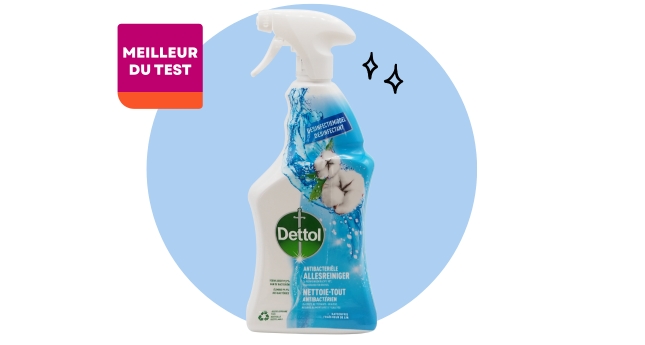 Ce produit Dettol se classe comme le meilleur du test des détergents multi-usage en spray. Il présente une très bonne efficacité pour éliminer les taches tenaces et une excellente composition.
