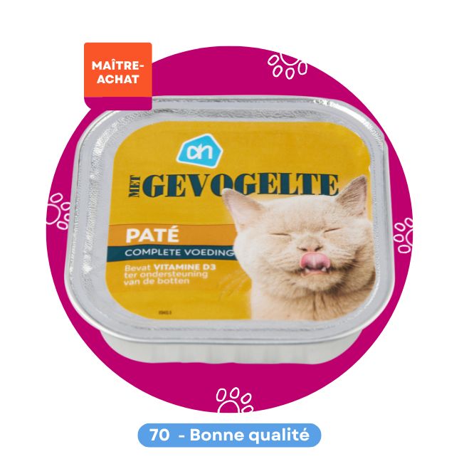 - Notre avis : nourriture humide très abordable avec un bon score nutritionnel. Teneur en protéines, minéraux et vitamines, taurine et rapport oméga 3/oméga 6 sont tous bons à suffisants. La qualité des ingrédients de ce pâté pour chat est bonne.