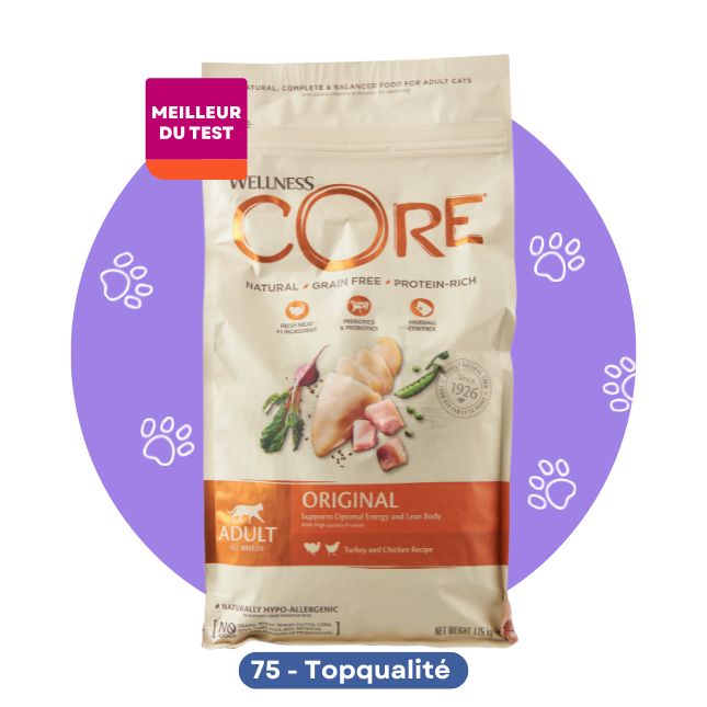 - Notre avis : ces croquettes ont la meilleure valeur nutritionnelle de toutes les croquettes pour chats testées en 2025. Ces croquettes contiennent suffisamment de protéines, de taurine, de minéraux et d'acides gras et de vitamines pour votre chat, et le rapport oméga 3/oméga 6 est également bon. La qualité des ingrédients utilisés est bonne, avec des graisses et des protéines de qualité (pas trop de collagène), et pas trop de calcium. Malheureusement, ce produit est l'un des plus chers de ce test.