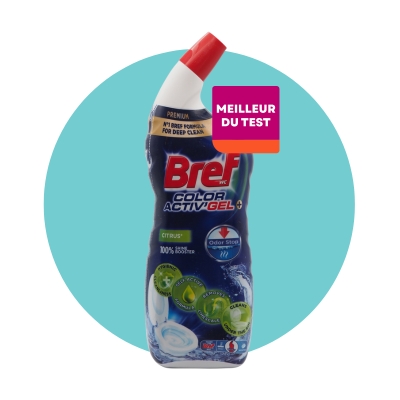 Ce nettoyant WC de la marque Bref obtient notre label Meilleur du Test et une note de 78 sur 100, tout comme le détartrant Canard WC 100%. Grâce à l'acide chlorhydrique contenu dans ce nettoyant pour toilettes, ce produit détartre très bien et a un pH bas, ce qui lui permet de s'attaquer efficacement à la saleté et de garder vos toilettes hygiéniques. Malgré son adhérence limitée à la surface, il nettoie très efficacement, tant sous forme pure que diluée. Et ce, en quelques minutes seulement, contre une quinzaine de minutes avec les deux autres nettoyants pour toilettes présentés ici. En termes d'impact environnemental, la formulation est bonne, avec peu d'ingrédients. Le seul bémol est le prix : à 6 € le litre, c'est le produit le plus cher de notre top 3.