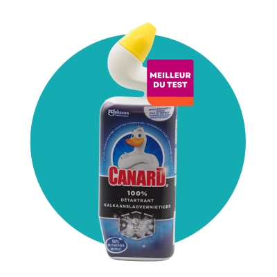Le détartrant Canard-WC 100% obtient également notre label Meilleur du Test avec un score final de 78 sur 100. La composition est très similaire à celle du produit Bref, avec le chlorure d'hydrogène comme ingrédient actif ici aussi et un pH très bas. Cela permet un excellent détartrage et un nettoyage presque parfait, ce qui n'est pas évident pour un produit WC. Cependant, il adhère peu à la surface des toilettes et s'écoule donc plus rapidement, ce qui peut réduire les performances de nettoyage. Bien que cela ne se voie pas à l'œil nu, l'efficacité du nettoyage est excellente et une grande partie de la saleté est éliminée. Par ailleurs, l'impact environnemental des ingrédients est très limité. Enfin, à 4,57 € le litre, ce produit WC est moins cher que le nettoyant Bref.