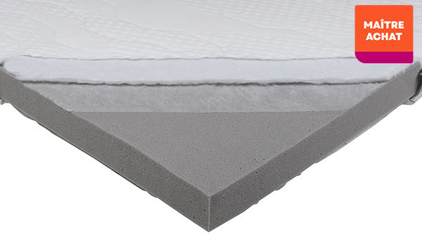 Il s'agit du surmatelas le plus fin de notre sélection, avec une épaisseur de seulement 5 cm. Cette faible épaisseur n'est pas un problème : ce modèle en mousse froide (PU HR) avec une couche en mousse PU standard offre un bon soutien aux personnes dormant sur le dos ou aux personnes légères dormant sur le côté. Ainsi, il obtient le meilleur score de soutien corporel de tous les surmatelas testés.