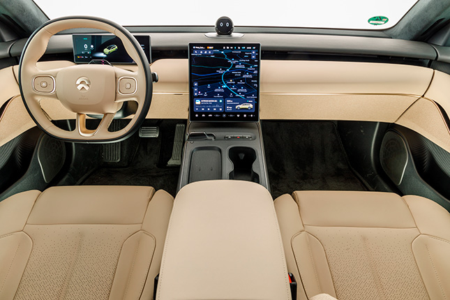 L’ET5 offre une conduite silencieuse et des sièges confortables (avec fonction massage et chauffage en option) dans un habitacle au design minimaliste. Presque toutes les fonctions sont commandées via l’écran tactile central. Cela donne un aspect épuré, mais peut aussi se révéler frustrant à l’usage. L’absence de boutons physiques peut en effet détourner l’attention du conducteur.