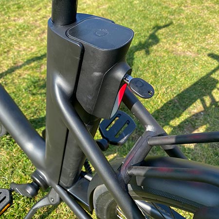 Une clé permet de retirer facilement la batterie du cadre, pour la recharger à la maison ou au travail. Un autre avantage, c’est que les fixations de la selle se situent derrière cette batterie. Dès lors, quand votre vélo est garé avec sa batterie, il n’est pas possible de voler sa selle.
