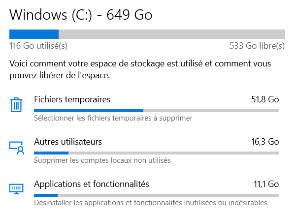 Pour pouvoir cloner votre disque, il faut que votre nouveau SSD dispose d'un espace suffisant. Vous pouvez vérifier l'espace que vous utilisez actuellement en allant dans Démarrer et en tapant Stockage. Cliquez ensuite sur Paramètres de stockage, où vous pourrez voir le volume de stockage utilisé.