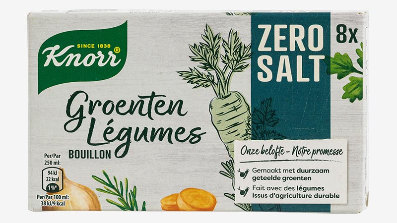 - Knorr Zero Salt: ces cubes sont sans sel ajouté, mais contiennent du sirop de glucose. Ce produit coûte 0,51€/L, et est disponible chez Delhaize et Albert Heijn.