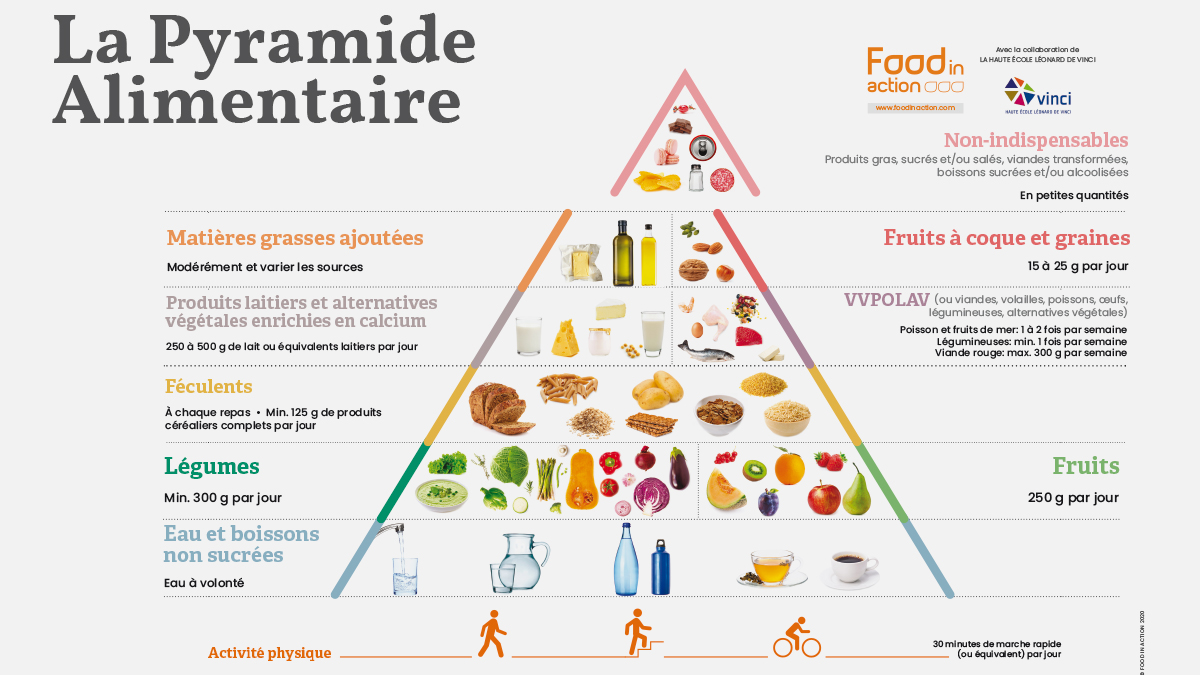 On ne peut nier l’impact écologique de notre alimentation. C’est pourquoi la nouvelle pyramide intègre la dimension durabilité qui s’exprime au travers de plusieurs changements.