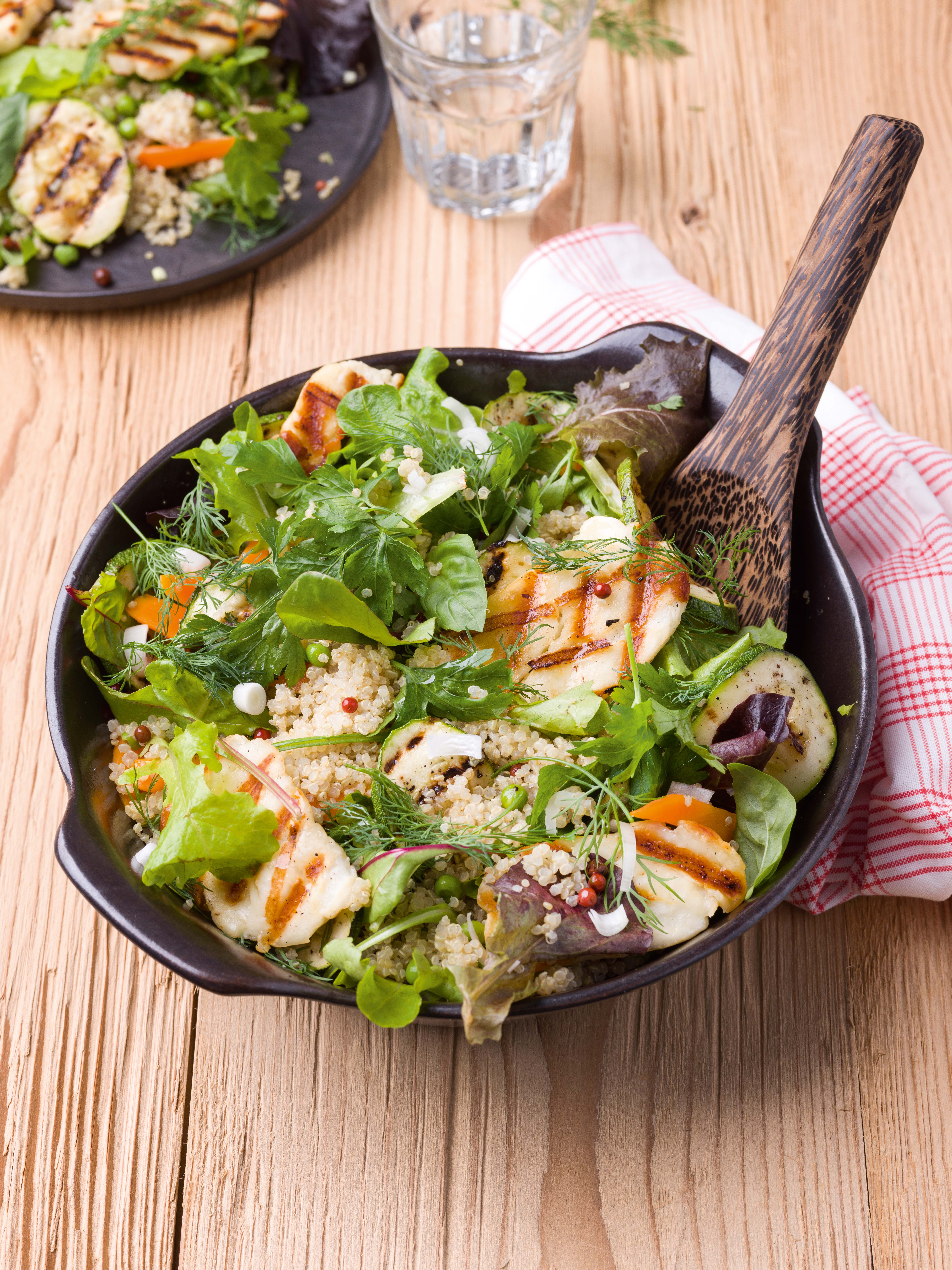 - Placez l’halloumi au-dessus de la salade et recouvrez le tout avec l’aneth, le persil plat et le basilic.