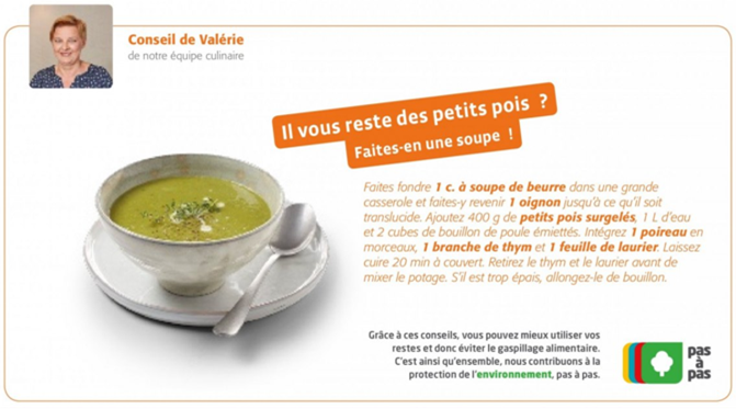 La promotion des légumineuses passe aussi par les magazines des supermarchés. Ainsi Colruyt, dans son dépliant Inspiration, propose une recette anti-gaspi avec un reste de pois via sa rubrique « le conseil de Valérie ».