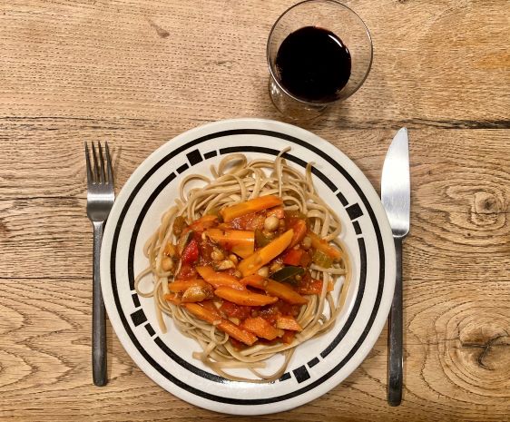 Ingrédients : 200g de hachis mélangé, 75g de pois chiches (en conserve ou bocal), 75g de lentilles (en conserve), 2 carottes, 2 branches de céleri, 1 poivron rouge, 200g de champignons, 1 oignon, 3 gousses d’ail, 600g de tomates pelées (en conserve), 2 cubes de bouillon de légumes, 2 c. à soupe d’huile d’olive, 1 cuillerée d’origan, ½ cuillerée de harissa, sel & poivre, 2 feuilles de laurier, 1 branche de thym.