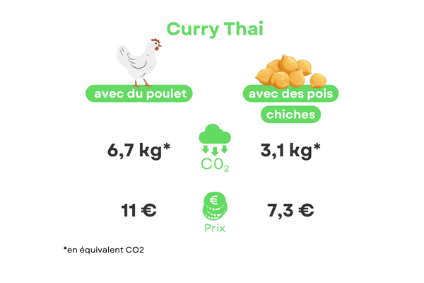 L'élevage intensif, surtout de viande bovine, compte pour beaucoup dans les émissions de gaz à effet de serre. Faire l'impasse sur la viande, même s'il ne s'agit ici que de poulet qui en émet moins que le gros bétail, permet de diminuer notre quota d'émissions. Nous avons fait le calcul : la recette classique du poulet curry thaï compte pour 6,7 kilos équivalent CO2 (ensemble des gaz à effet de serre, dont le CO2), contre seulement 3,1 kilos « eqCO2 » dans la version avec les légumineuses. Cultiver 1 kilo de pois chiches nécessite par ailleurs 11 fois moins d'eau que produire 1 kilo de volaille. Sacrée gain pour la planète, non ?