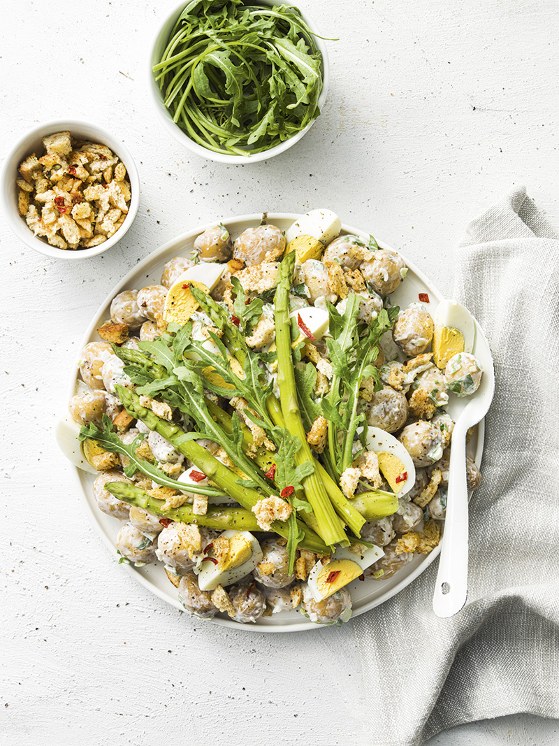 - Versez le dressing au yaourt sur les pommes de terre et les pousses de navet. Mélangez. Répartissez ensuite les asperges vertes par-dessus et les œufs coupés en deux. Terminez avec la pangritata.
