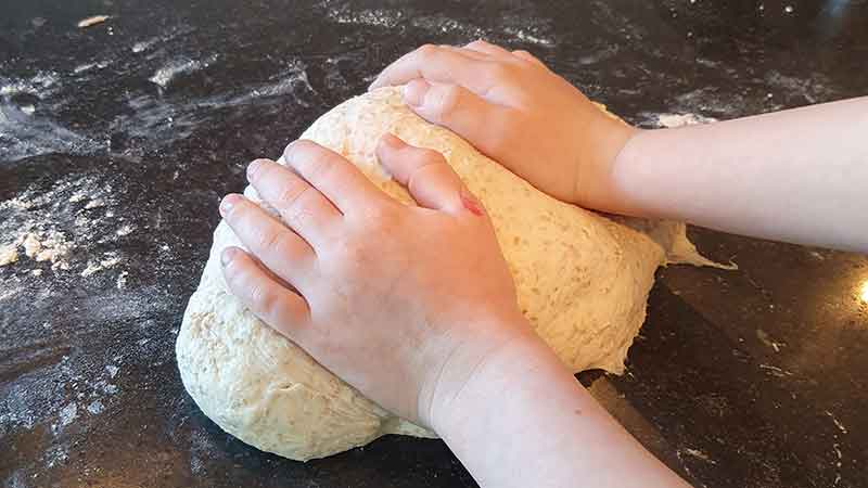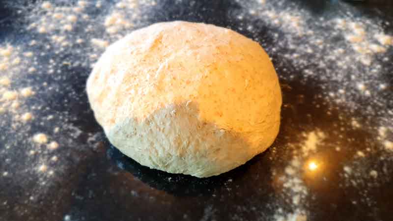 Pétrissez la pâte quelques minutes et écrasez toutes les bulles d’air qui se sont formées pendant le levage. Si la pâte est trop collante, mieux vaut encore la saupoudrer d’un peu de farine. Façonnez ensuite la pâte jusqu’à ce qu’elle présente une forme parfaitement ronde.