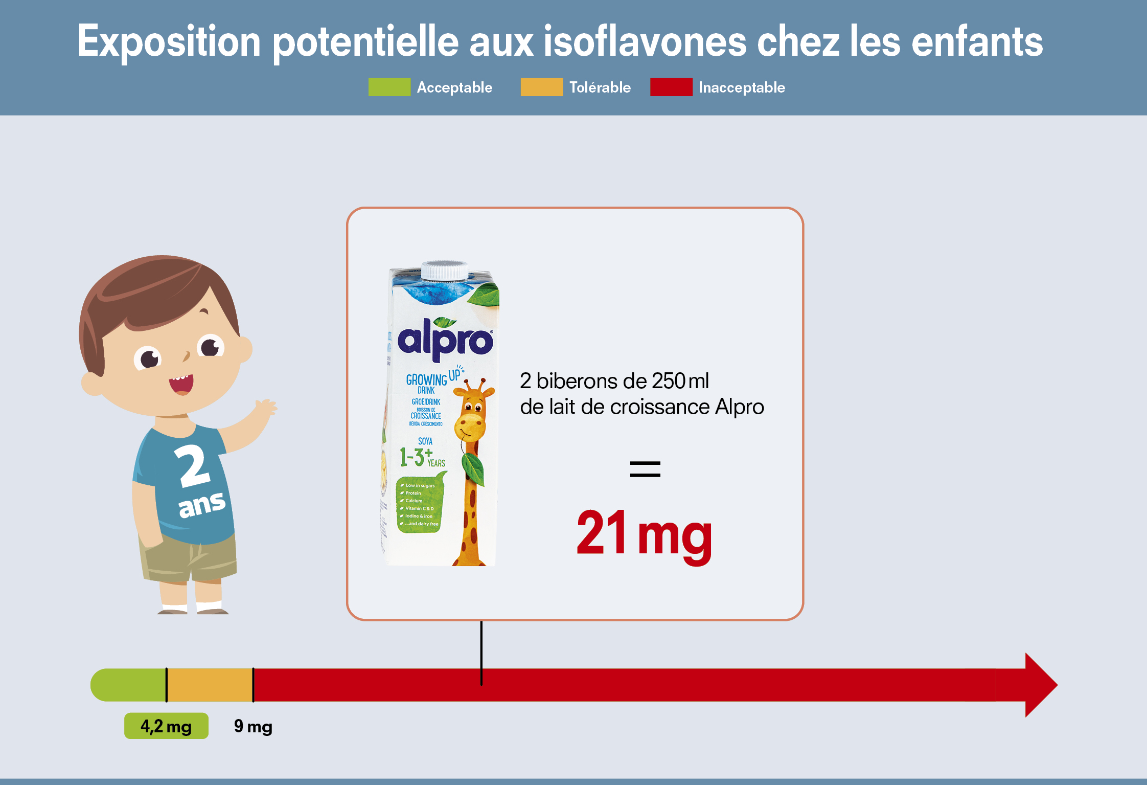 En revanche, la boisson de croissance "Alpro soya 1-3+", on atteint 10,8 mg d’isoflavones par biberon, soit environ 21 mg d’isoflavones par jour avec deux biberons. Pour des enfants de 9 à 14 kg (de 1 à 3 ans), cette valeur dépasse jusqu'à 6 fois la limite quotidienne acceptable fixée. Malheureusement, le consommateur ne dispose pas de cette information pour faire un choix éclairé.