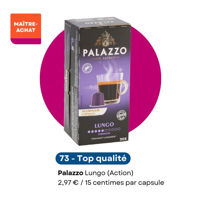 Ces capsules de marque de distributeur sont l'un des produits les moins chers de notre test, pour une qualité optimale. Bref, un excellent rapport qualité-prix qui lui permet d'obtenir notre label Maître achat. Uniquement disponible chez le discounter Action.