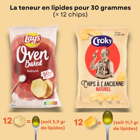 Étant donné qu’ils sont souvent frits, les chips sont riches en graisses. Comptez en moyenne 25,8 g de lipides pour 100 g de chips. La qualité des graisses varie selon le type d’huile utilisé (tournesol, palme, etc.), ce qui peut faire varier la quantité d’acides gras saturés (les “mauvaises” graisses).