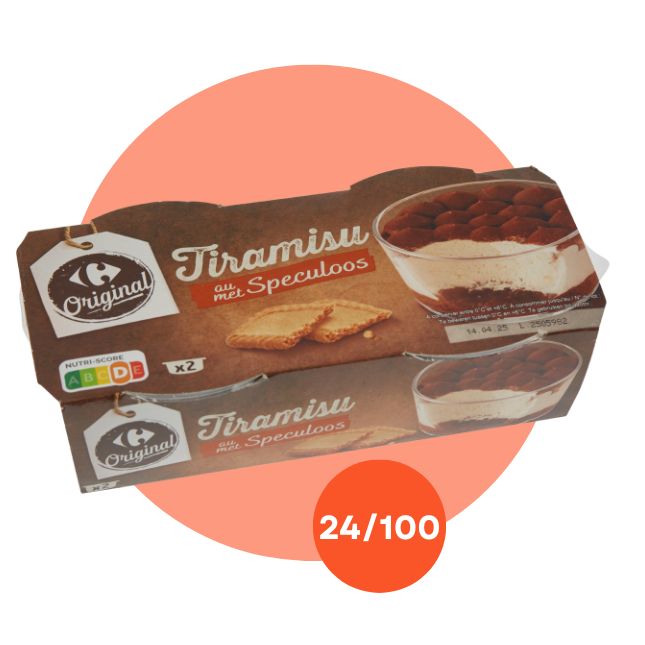 Notre analyse a révélé la présence d’additifs et d’ingrédients ultra-transformés dans les 11 tiramisus testés. L’un des produits, le tiramisu au Spéculoos de Carrefour, contenait 8 additifs et 7 ingrédients ultra-transformés. Avec sa note de 24/100, il s’agit d’ailleurs du pire tiramisu de notre test.