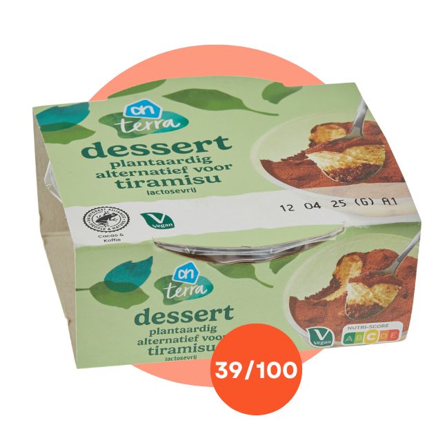 Le tiramisu végan (sans lactose) vendu par Albert Heijn est le moins mauvais choix. Il obtient un score de 39/100, et se classe donc tout de même dans les « moins bons choix ». La taille de la portion est correcte, puisqu’il est vendu en pot de 95 grammes. Son point fort est d’être adapté aux régimes végétariens et aux intolérants au lactose, mais en contrepartie, il contient 6 additifs et 9 ingrédients ultra-transformés, ce qui n’est pas rien… Son nouveau Nutri-Score est D.