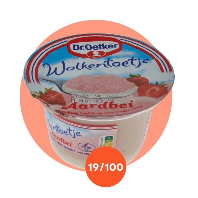 Eh oui, c’est bien une mousse aux fraises qui remporte la palme du pire dessert. Il s’agit plus précisément du Dessert aux nuages Fraise de Dr. Oetker. Sa liste d’ingrédients est très longue et témoigne donc d’un produit fini ultra-transformé. Nous avons retrouvé pas moins de 7 additifs et 11 ingrédients ultra-transformés dans sa composition. Son Nutri-Score est, sans grande surprise, un Nutri-Score E.