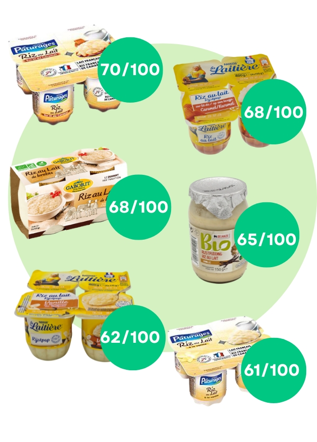 Bien qu’il doive être consommé, comme tout autre dessert, avec modération, le riz au lait est le produit qui contient le moins de graisses aux 100 grammes dans les 5 catégories de desserts lactés analysés dans notre test. C’est, entre autres, ce qui permet aux riz au lait de notre panel d’afficher un Nutri-Score compris entre A et C, ce qui reste tout à fait honorable pour un produit sucré.Il est possible de trouver des riz au lait sans additif ou ingrédient ultra-transformé