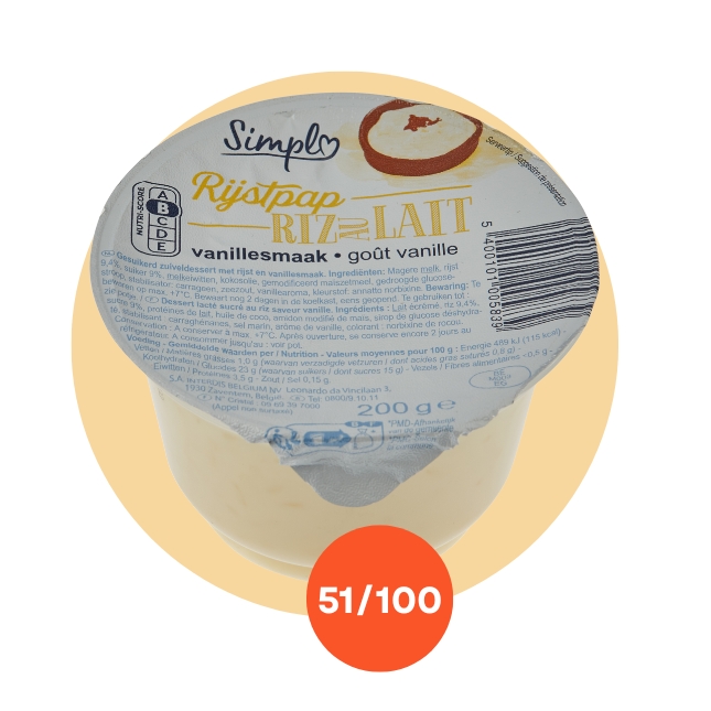Le produit qui finit dernier de notre test est le Riz au lait à la vanille de la marque Simpl (Carrefour). Celui-ci affiche sur son emballage un Nutri-Score B, mais la nouvelle méthode de calcul n’est pas encore prise en compte par le fabricant. Notre calculateur nous a permis de voir que ce riz au lait a en fait un (nouveau) Nutri-Score C. Ce produit figurait déjà dans les pires riz au lait de notre test en 2024.