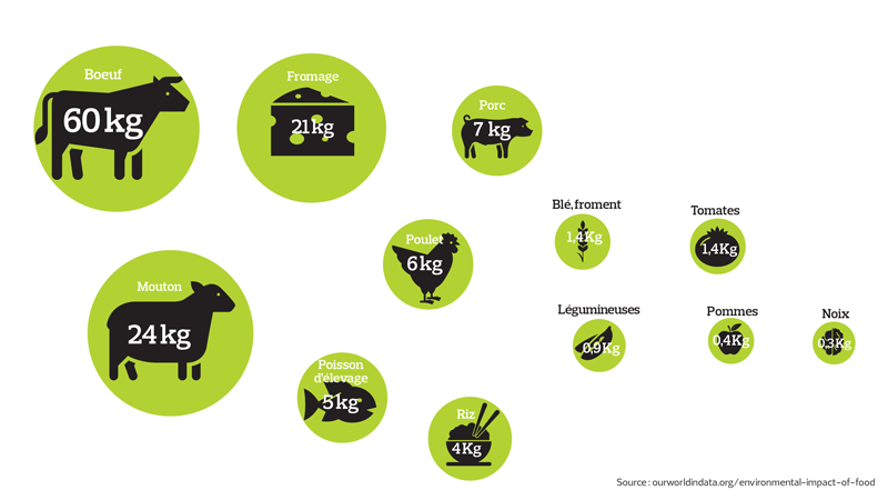 et d’énergie. Ajoutez à cela les gaz à effet de serre dégagés par le fumier et la digestion des bovins et vous obtenez la raison de l’empreinte énorme du bœuf. Car, plus l’animal est grand, plus son impact est important sur l’écosystème. Le bœuf, l’agneau et le fromage pèsent donc le plus lourd. La volaille et les œufs nettement moins. Le porc se situe entre les deux.