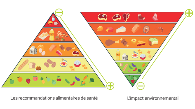 Autre guide précieux pour savoir quels aliments consommer en priorité : la pyramide d’une alimentation saine élaborée par nos autorités de santé publique. Si vous observez bien les deux pyramides ci-dessous, vous verrez que les aliments qui du point de vue nutritionnel et de santé devraient être consommés du plus fréquemment (la base la plus large à gauche) sont souvent aussi ceux qui ont le plus faible impact sur la planète, et vice versa. Ceci à l'exception de la viande.