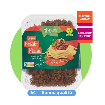 Vers le haut de la pageLe haché veggie de la marque Vemondo (Lidl) est le Maître achat et le Meilleur du Test. Il a reçu une note acceptable pour ce qui est du goût, mais se démarque d’autant plus par sa composition tout à fait correcte, avec peu d’additifs et aucun contaminant.