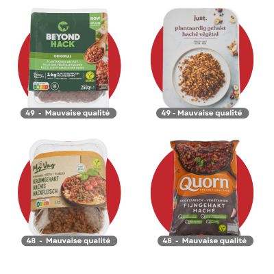Sur les 15 produits analysés, 4 finissent avec un score inférieur à 50 sur 100. Ils tombent dès lors dans la catégorie des produits à ”ne pas acheter”. Il s’agit des hachés veggie des marques suivantes : Beyond Hack, Just, My Vay (Aldi) et Quorn.