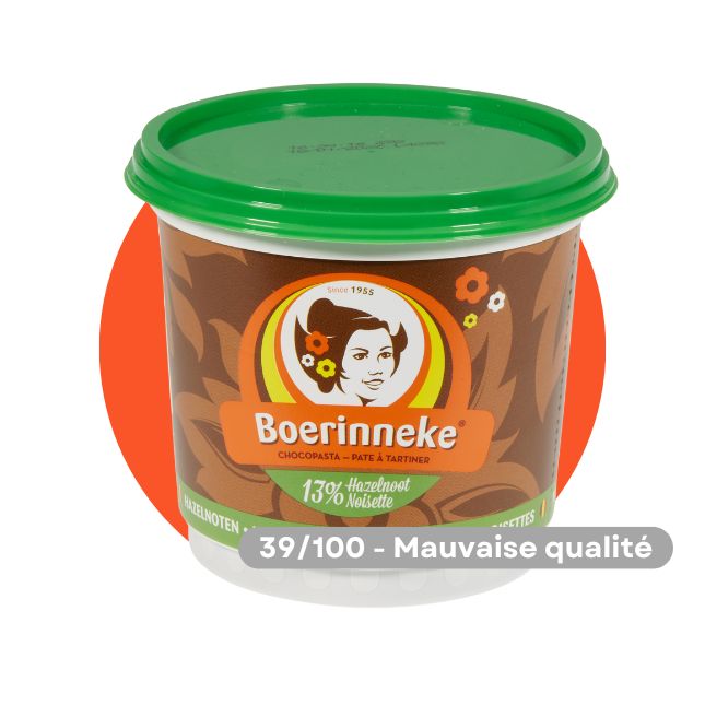 La pâte à tartiner noisettes Boerinneke a déçu les testeurs en raison d’une consistance trop ferme, d’une texture trop granuleuse, et d’un goût de noisette trop fade. Si l’on combine cette piètre évaluation aux mauvais résultats obtenus pour les contaminants MOSH et MOAH, la pâte à tartiner Boerinneke finit malheureusement dernière du test avec la note de 39/100. Cette pâte à tartiner est donc déconseillée.