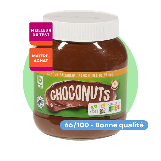 C’est donc la pâte à tartiner d’une des marques maison de Colruyt qui décroche le meilleur score du test: le produit Boni Selection Choconuts sans huile de palme obtient 66/100. Il obtient à la fois le label Maître achat et le label Meilleur du test.