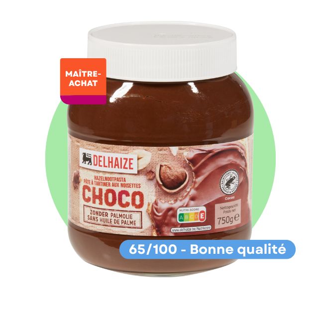 Cette pâte à tartiner aux noisettes et au cacao de la marque maison Delhaize, sans huile de palme, a obtenu un très bon score pour le goût.